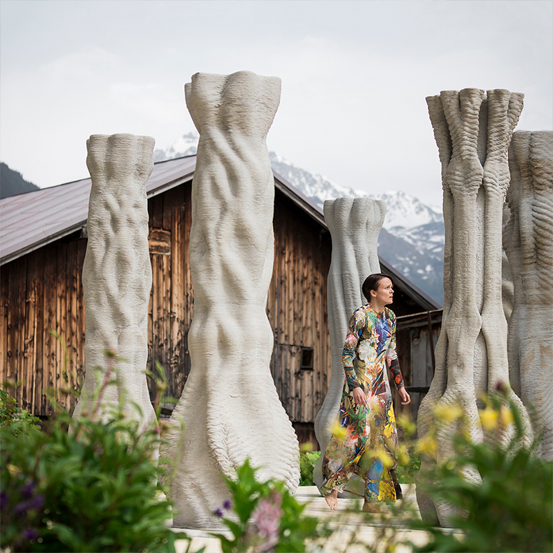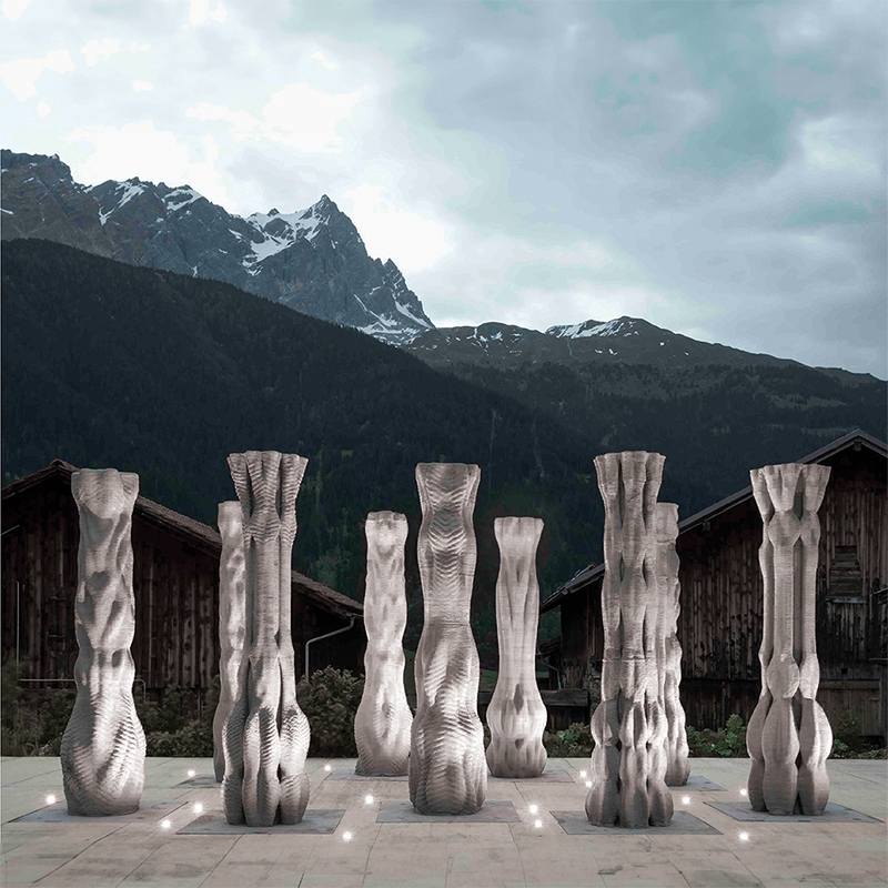 In collaboration with the Origen Festival in Riom, Switzerland the installation Concrete Choreography consists of nine, individually designed, 2.7m tall columns. Each column is concrete 3D printed at full height in 2.5 hours with the process developed at ETH Zurich, with the support of NCCR DFAB.