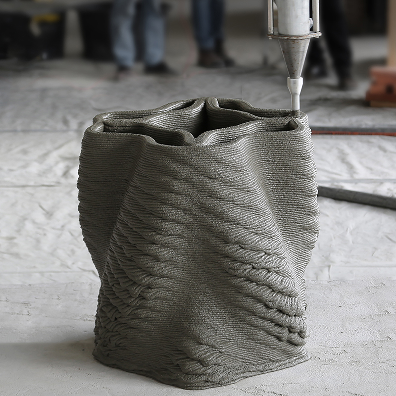This novel fabrication process allows the production of concrete elements without the need for any formwork. In addition, one-of-a-kind designs with complex geometries can be fabricated in a fully automated manner. Hollow concrete structures are printed in a way where the material can be strategically used only where needed, allowing a more sustainable approach to concrete architecture.